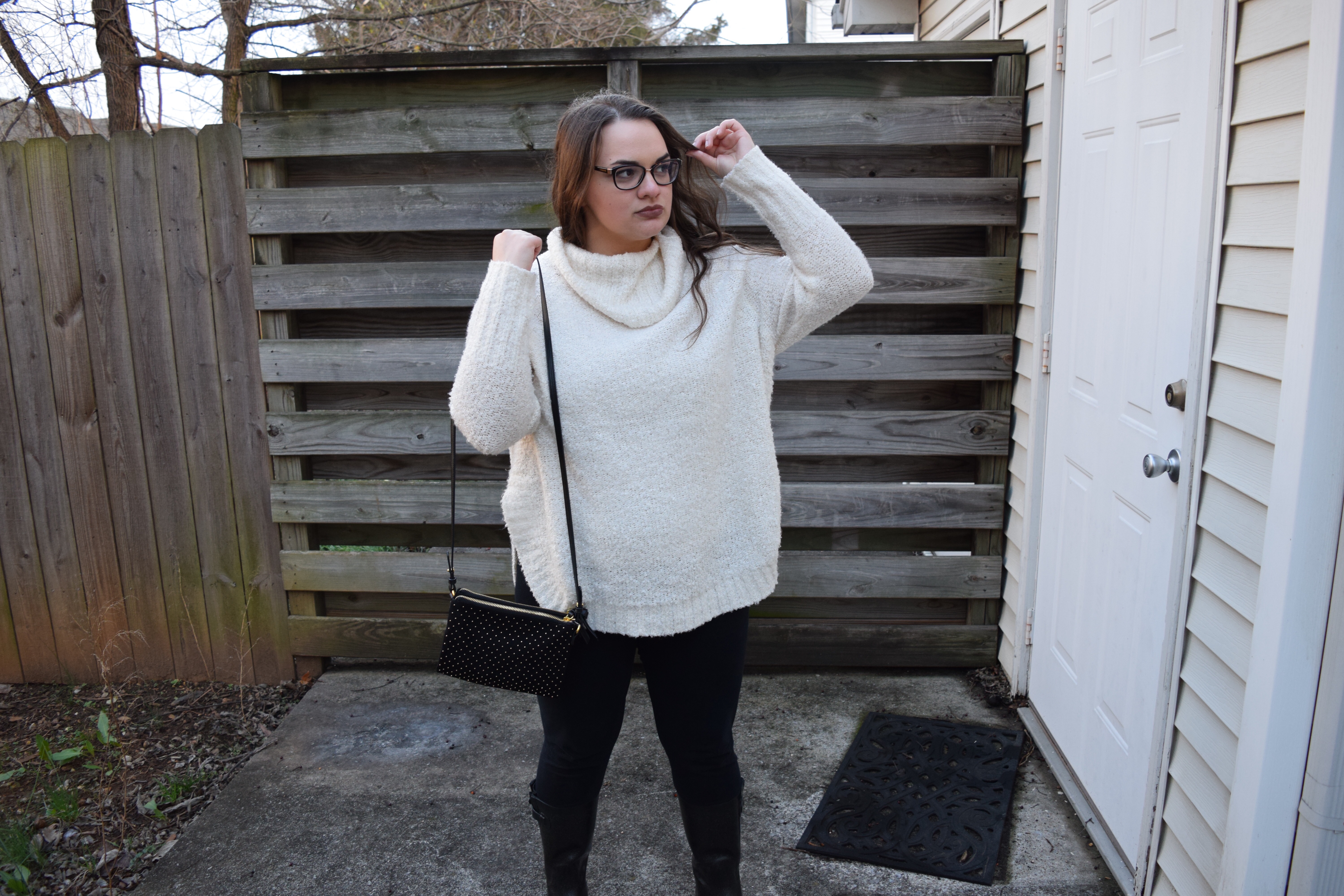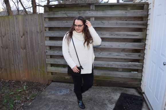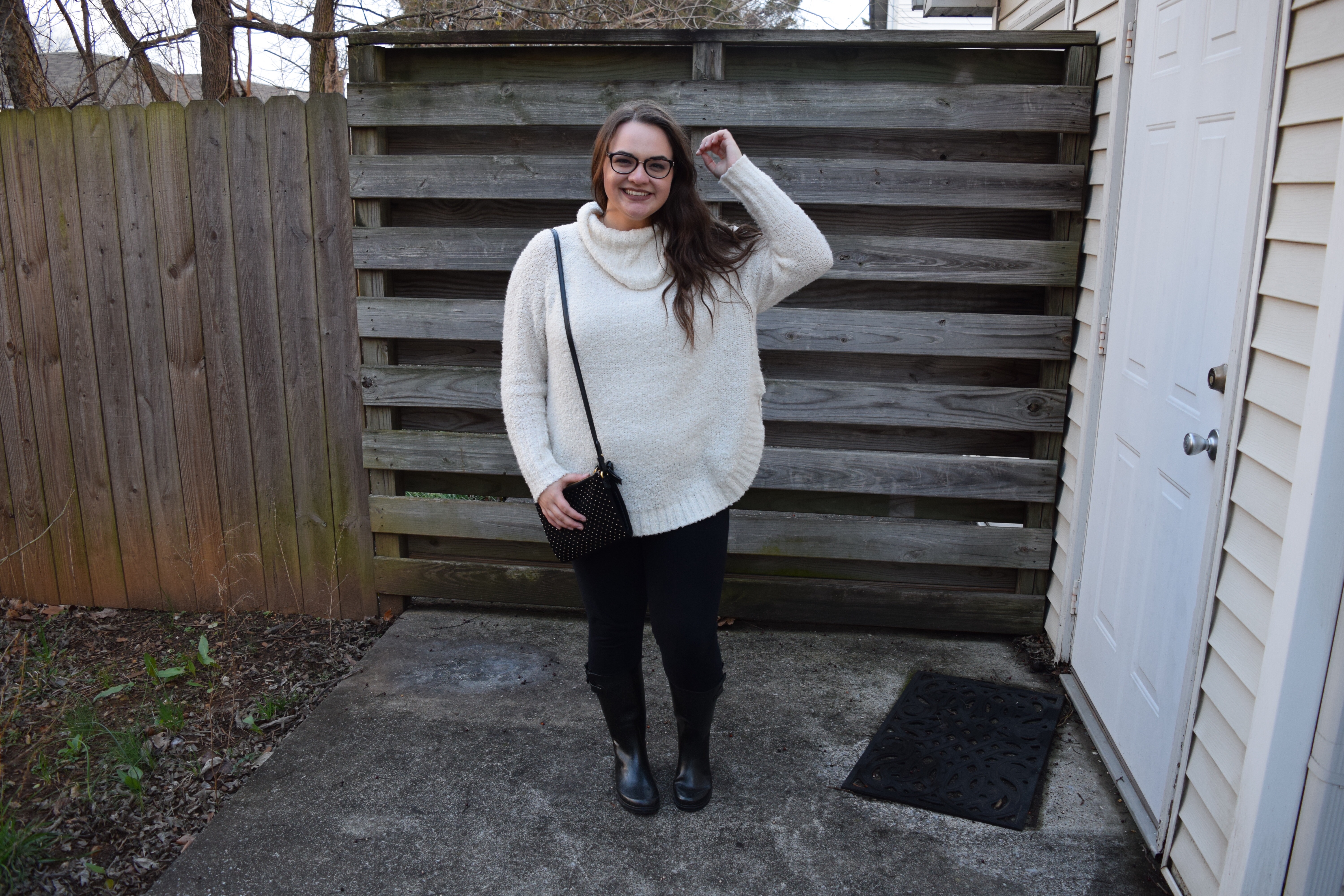 I decided to style my rainy day look with black glitter rain boots from Payless, Lauren Conrad from kohls leggings, and this turtleneck sweater from… Walmart. Gasp.
