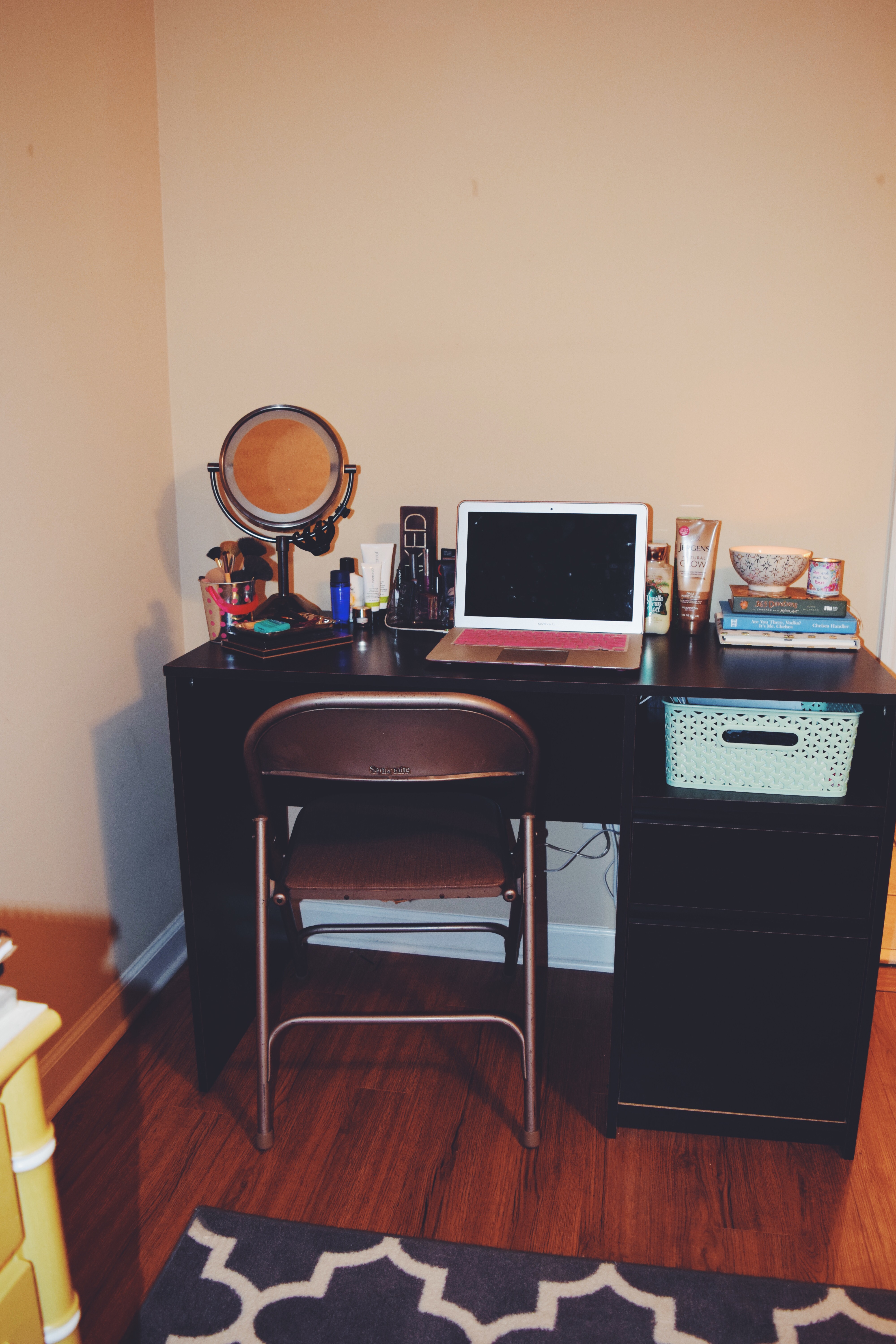 My desk is from.. target. I can’t throw y’all off. I’m in love with target. I don’t care who knows it. I also use this as a vanity with my great mirror my mom got me for Christmas. It works great. The desk comes with “shelf” for the top, but it was the perfect size for my little basket from Target to fit into, and I think it’s way cuter that way. Back with the incomplete trend, I am using a folding chair as a desk chair for now. Of course, I am going to be upgrading that soon too. I also want to put a pin board above my desk.