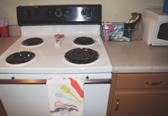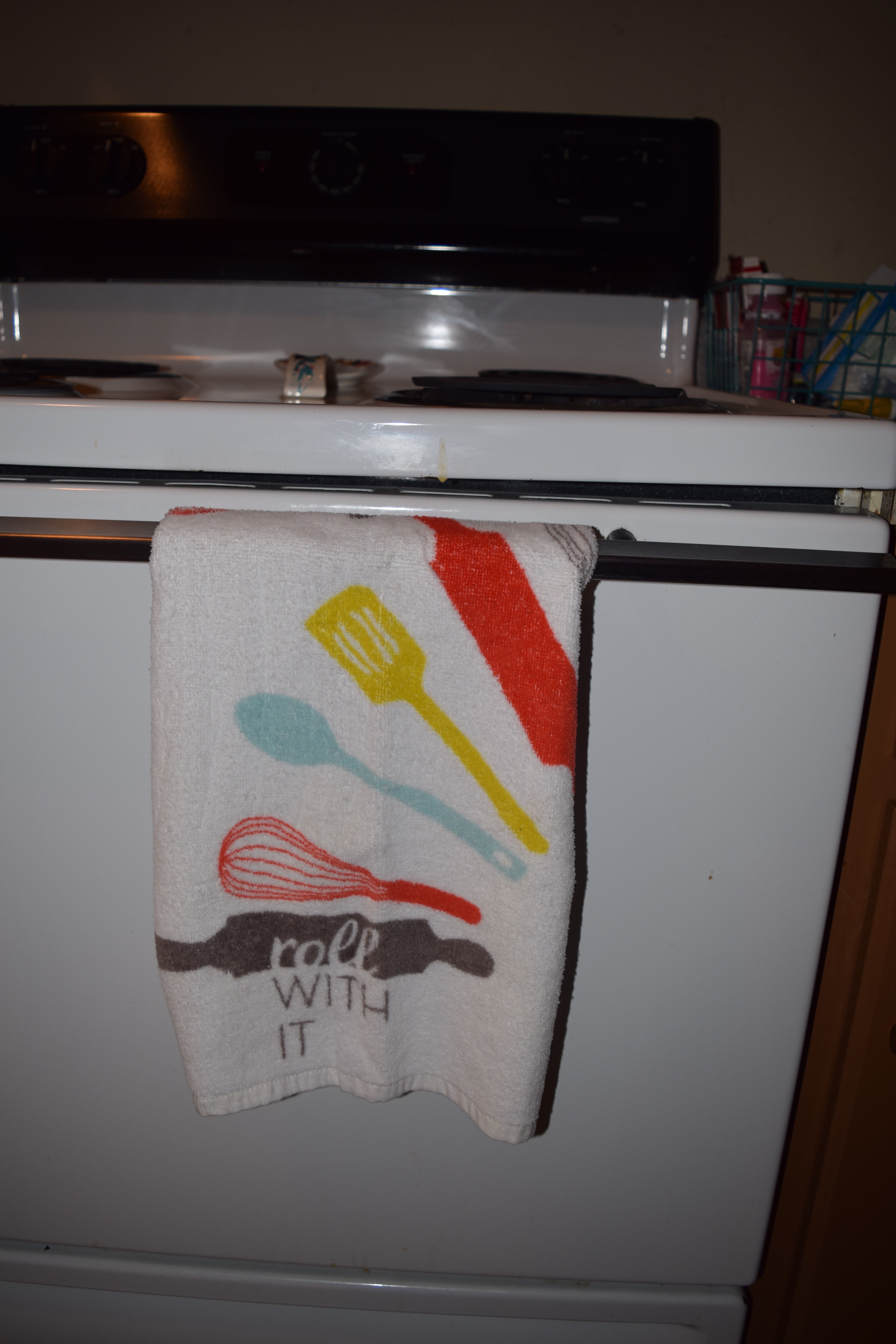 Our kitchen is so adorable to me with its painted orangy brown cabinets. It has a personality of its own. Our appliances aren’t updated & it’s nothing fancy, but it’s perfect for whipping up frozen pizza and hamburger helper! My dishtowl is from Target and my other accents are from Walmart (the spoon holder is from The Pioneer Woman). I want to get some sticker decorative wall art to put above the oven, but I haven’t found any I really like yet.