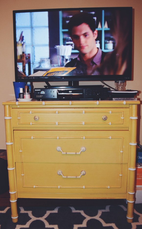 Last, but not least, I have a thrifted dresser used as a tv stand. My mom asked if I wanted to paint it, but honestly, I love the pop of yellow in my room. And of course, I’m watching gossip girl.