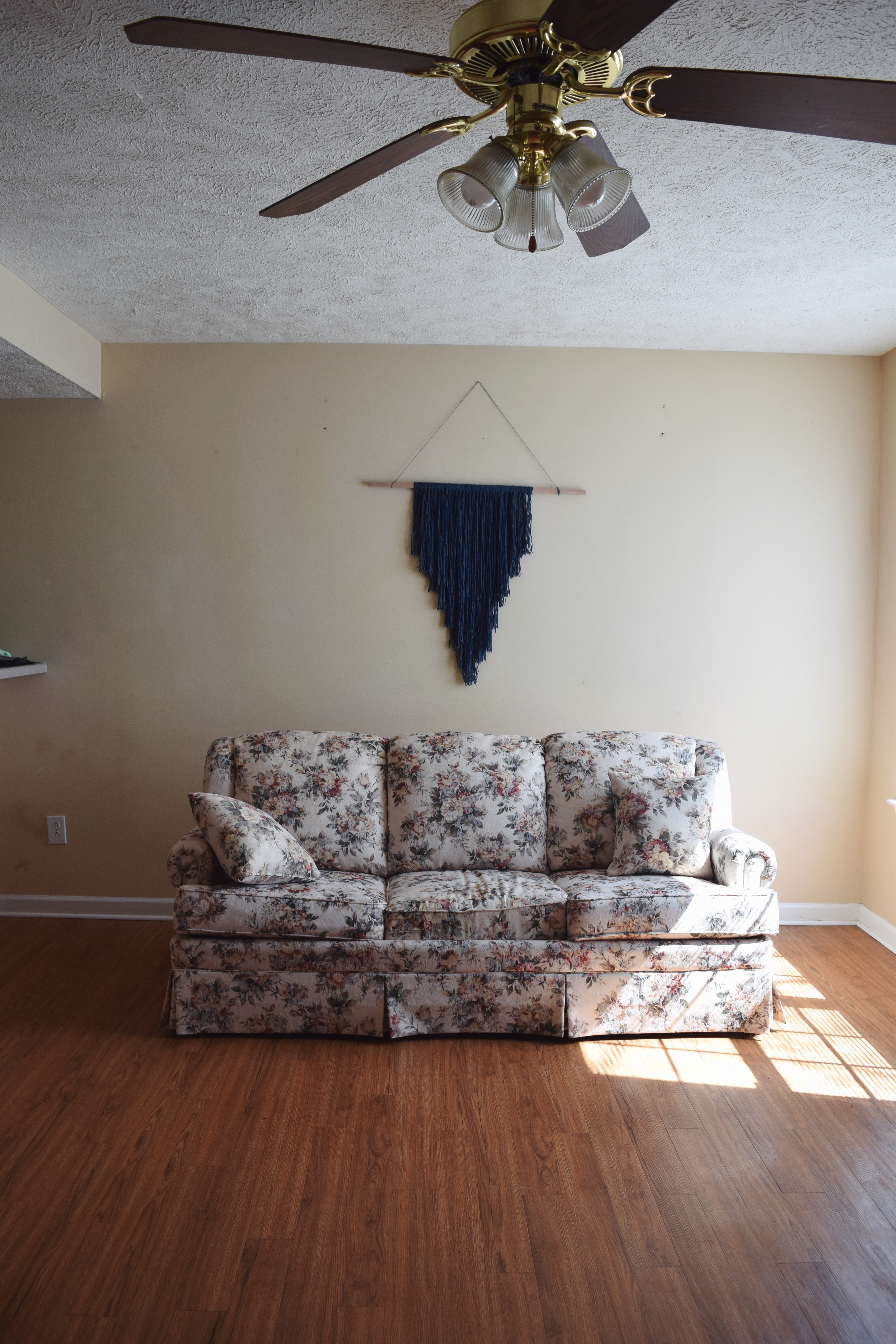 Our living room furniture was acquired from a sweet older lady my mom worked for, and as you can see it is very floral. This was not an issue to me, as my friends are constantly telling me I have grandma taste. I added a little bit of boho flair to the room with this yarn art diy I made a few posts back! Our living room is super large, but because of our college budget it’s incomplete. We still haven’t acquired a tv, barstools, an area rug, curtains, or a coffee table.. but we have the essentials. College living = a work in progress!