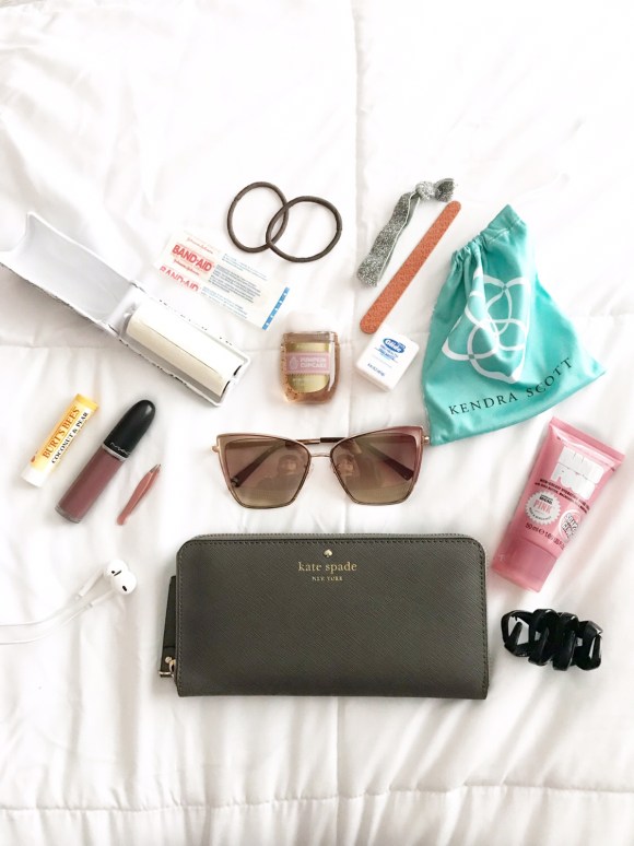 handbag | wallet | sunglasses | earpods | tweezers | lipstick | chapstick | lint roller (similar) | hand lotion